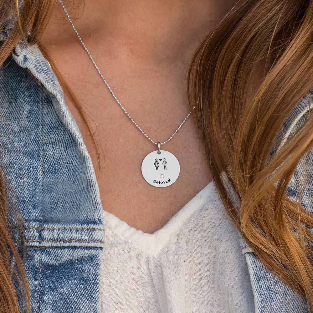 2. 产品性能:银/铜材质项链,超高质感、重量轻、易于挂起、不增加脖子的负担,圆片吊坠设计,上面刻有两个小人,非常适合情侣佩戴。